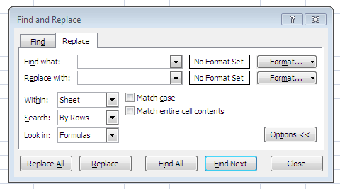 This is the most useful way to clean data in excel, using Find and Replace you can change reference in formulas, search and update formatting, interchange text or numbers etc. All you have to do is navigate to Home > Find and Select > Replace (You can also use keyboard shortcut – Ctrl + H.)