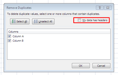 - On the next popup ‘Remove Duplicates’ you have to choose ‘My data has headers‘ in case you have columns header available. See the example bellow.