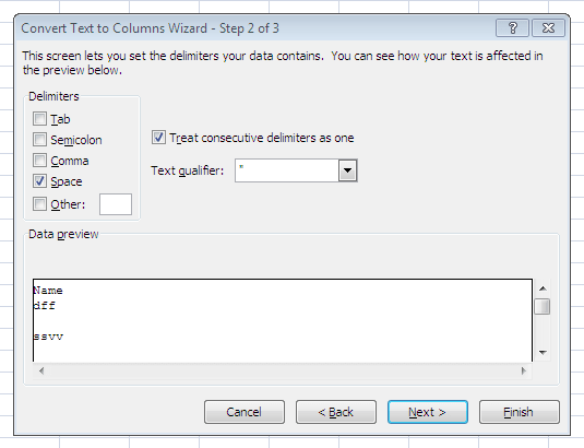 - Now you have to choose proper delimited radio button to separate the text, as per our example above we have a space between first and last name. So let’s choose ‘Space‘ checkbox.